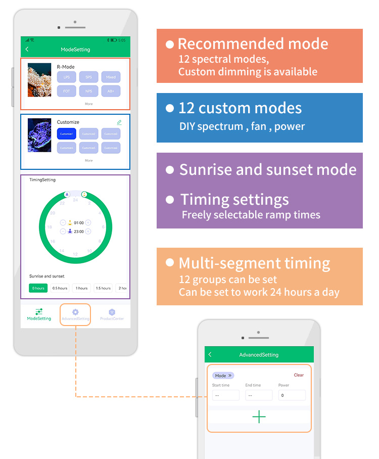 - Custom mode can set up multiple timing switches, color and brightness, etc.